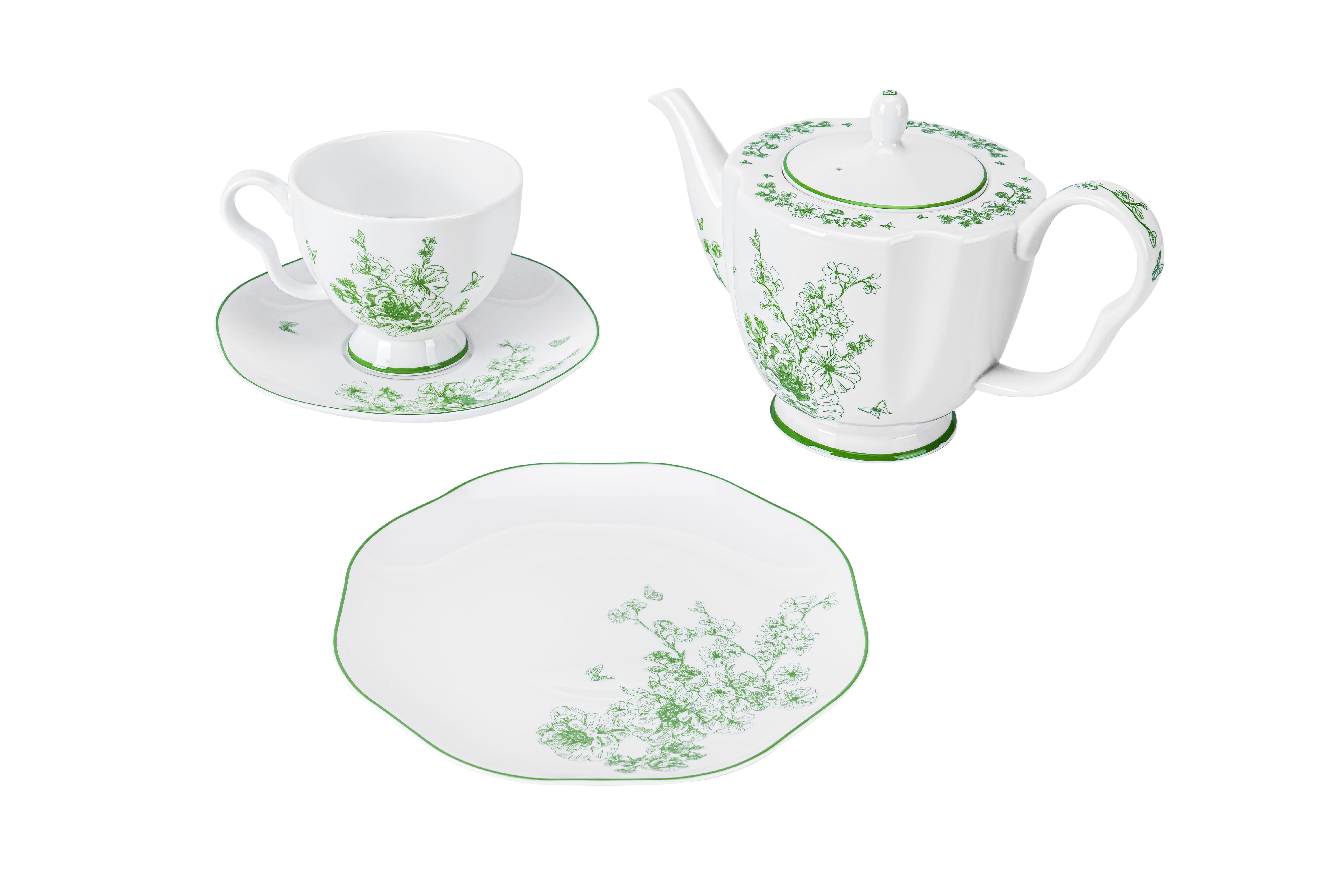 This bone china set, with its extraordinary texture and delicate craftsmanship, reflects the quiet passage of time and the grace of nature. The delicate green floral sketches bloom gently. They are not merely patterns but also the artist’s heartfelt ode to the beauty of nature. Each stroke by the artist captures this beauty in detail, filling simple lines that form every flower, leaf, and butterfly with depth and vitality. Expanses of white space serve as the finishing touch that allows the picture to breathe, inviting deeper imagination and reflection. It speaks to the cycle of flowers blooming and fading, the quiet indifference of time, and the soul’s endless pursuit of a beautiful life.